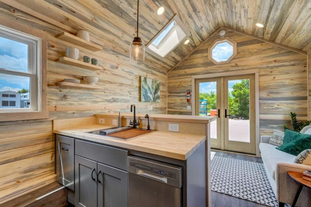 An ample living space with a large sofa, fireplace, a kitchen, and a well-appointed bathroom make this tiny home one to consider. The mix of rustic wood applications and dark metal framing on the windows are stunning. Discover all the details on the Wheelhaus website.